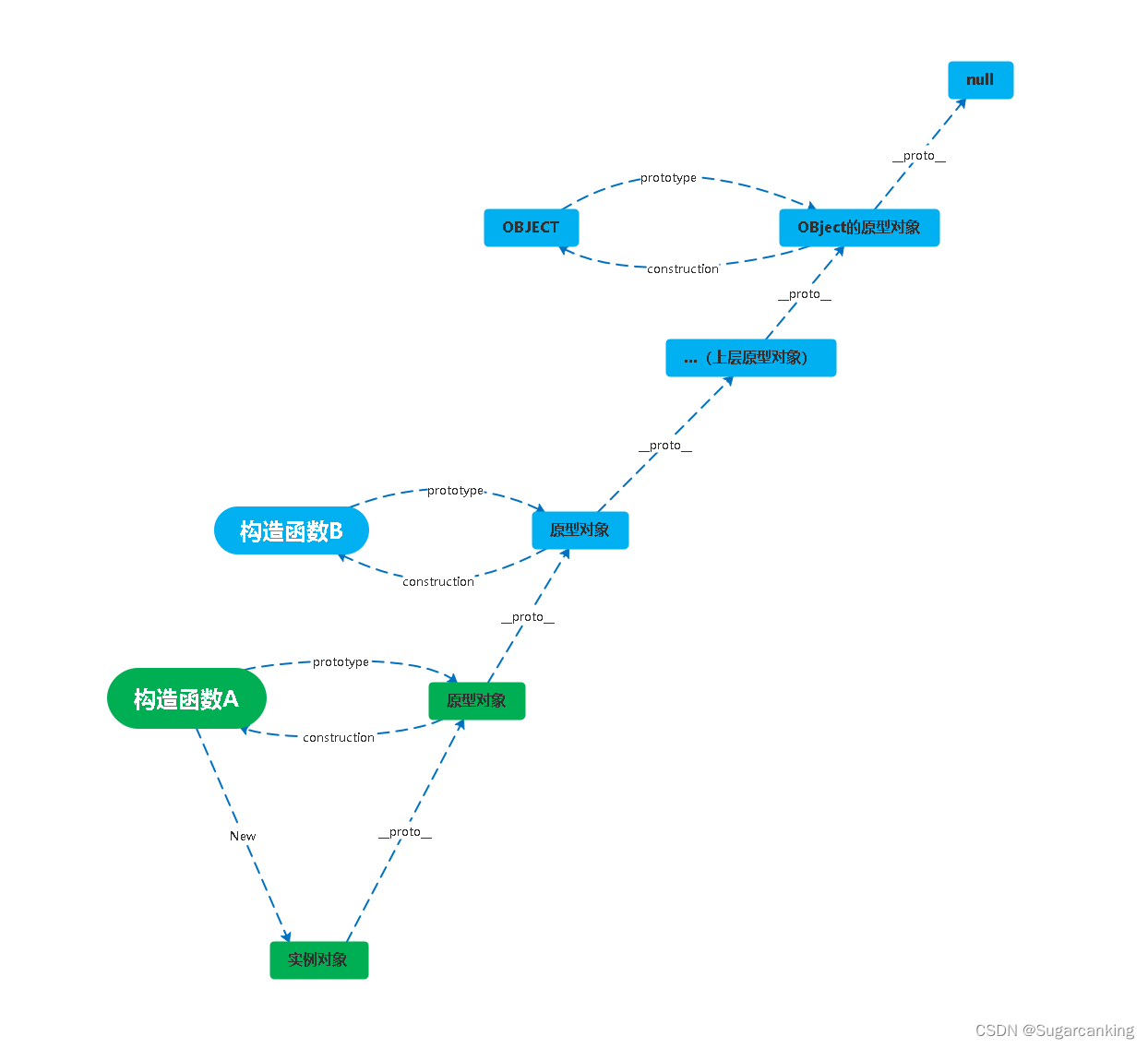 首先,我们根据这张图来看,何为原型链?要想知道何为原型链,首先要知道什么是原型,原型就是有一个构造函数,我们new一下这个构造函数得到了这个构造函数的实例对象,然后我们在这个实例对象中没有找到我们要用的方法或者属性,那么就会去他的原型对象中查找,如果还是没有找到,那么会去他的上层继续寻找,如果找到Object层还是没有找到,那么就会返回一个null;而实例对象到查找方法或属性的这条关系链就叫做原型链;