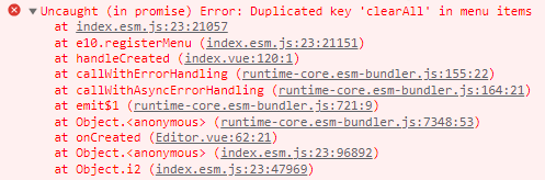 wangEditor自定义菜单遇到 Uncaught (in promise) Error: Duplicated key ‘clearAll‘ in menu items 富文本插件的时候来回切换导致的,报错的意思是你的富文本编辑器内部已经注册过clearAll这个菜单了,不允许在重复注册。首先要知道,出现这个报错是因为你在使用。