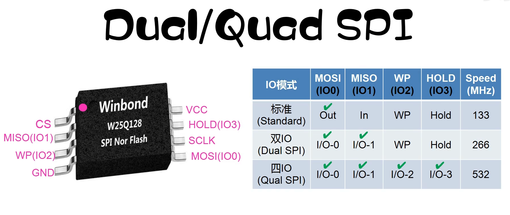 DualSPI支持两根信号线同时传输,等效时钟工作频率翻倍。