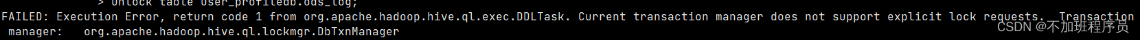 在日志中能大致了解跟锁相关,于是查询相关资料显示:在Hive中,当多个用户同时对同一张表进行读写操作时,可能会出现表被锁定的情况。这意味着其他用户无法对这张表进行写操作,从而导致任务阻塞或失败。为了解决这个问题,Hive提供了一种机制来解除表锁定,即通过使用unlock table命令来释放表锁。