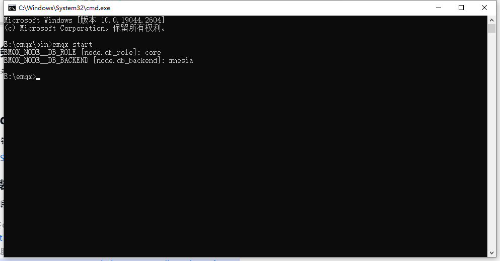 解压后在文件夹bin目录下打开DOS窗口,输入emqx start,出现如下画面,即开启mqtt服务器成功。
