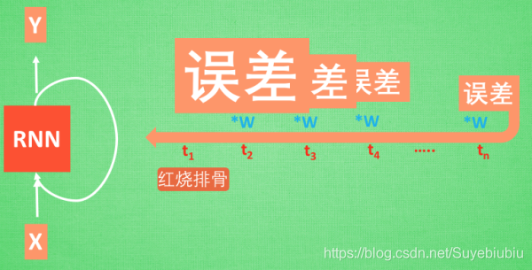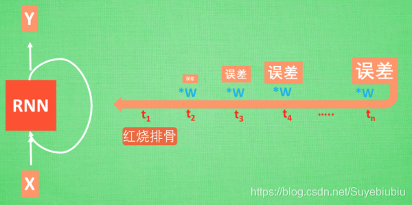 想像现在有这样一个 RNN, 他的输入值是一句话: ‘我今天要做红烧排骨, 首先要准备排骨, 然后…., 最后美味的一道菜就出锅了’, shua ~ 说着说着就流口水了. 现在请 RNN 来分析, 我今天做的到底是什么菜呢. RNN可能会给出“辣子鸡”这个答案. 由于判断失误, RNN就要开始学习 这个长序列 X 和 ‘红烧排骨’ 的关系 , 而RNN需要的关键信息 ”红烧排骨”却出现在句子开头,