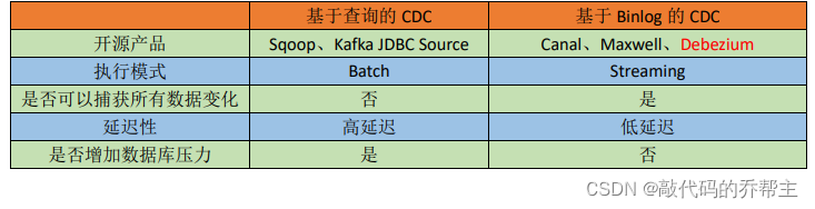 CDC 的技术方案非常多,目前业界主流的实现机制可以分为两种,基于查询的CDC和基于日志的CDC。