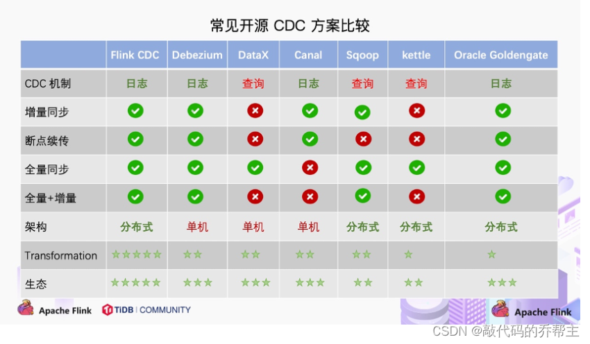 - 而对比全量 + 增量同步的能力,只有 Flink CDC、Debezium、Oracle Goldengate 支持较好。