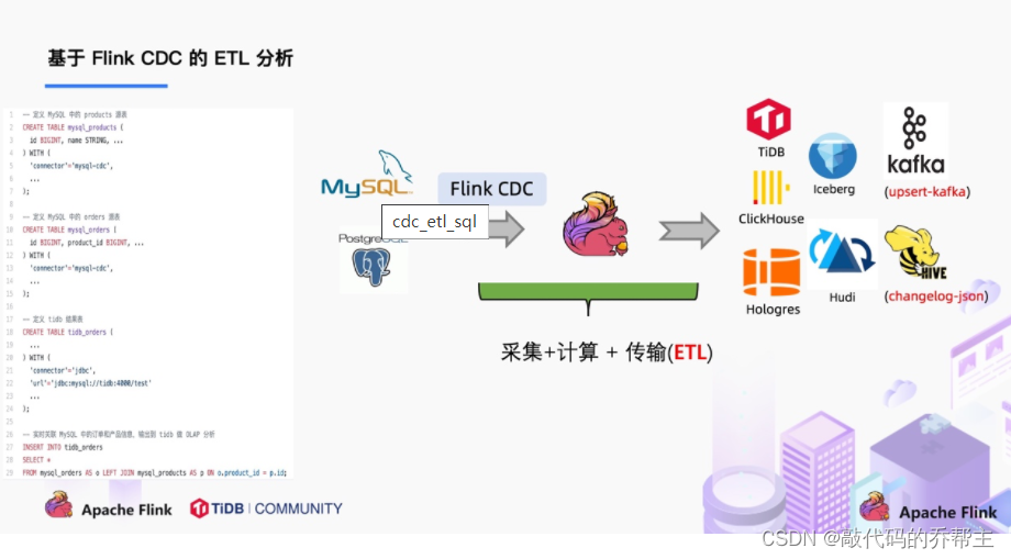 该例子是通过 Flink CDC 去同步数据库数据并写入到 TiDB,用户直接使用 Flink SQL 创建了产品和订单的 MySQL-CDC 表,然后对数据流进行 JOIN 加工,加工后直接写入到下游数据库。通过一个 Flink SQL 作业就完成了 CDC 的数据分析,加工和同步。大家会发现这是一个纯 SQL 作业,这意味着只要会 SQL 的 BI,业务线同学都可以完成此类工作。与此同时,用户也可以利用 Flink SQL 提供的丰富语法进行数据清洗、分析、聚合。