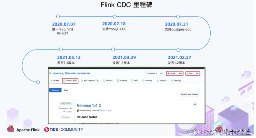 Flink CDC一开始只是阿里-云邪个人的一个兴趣孵化项目,于2020年7月提交了第一个commit,2020 年 7 中旬支持了 MySQL-CDC,2020 年 7 月末支持了 Postgres-CDC,一年的时间,该项目在 GitHub 上的 star 数已经超过 800。