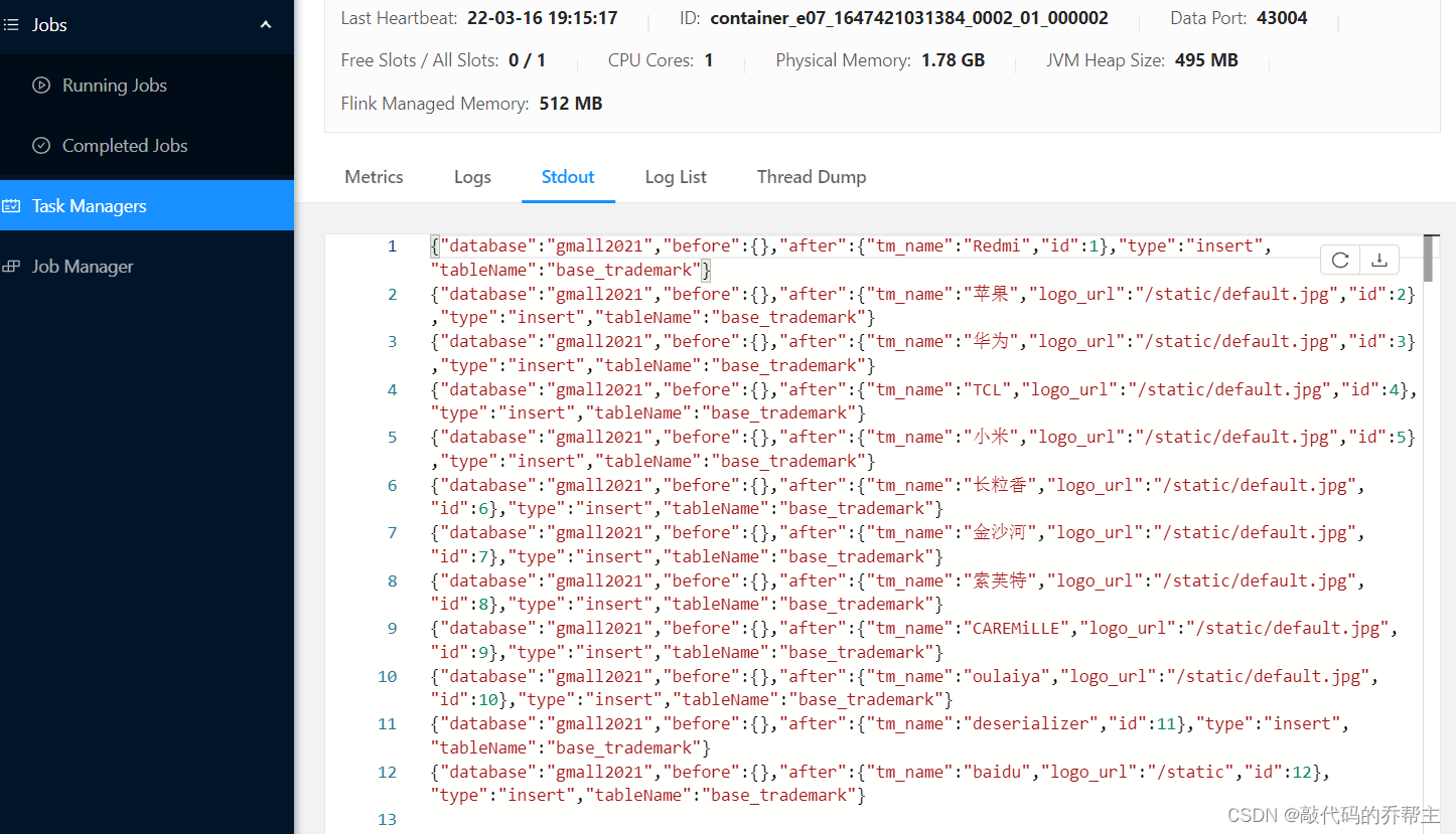 (3) 打开左侧TaskManagers中的Stdout查看控制台输出信息