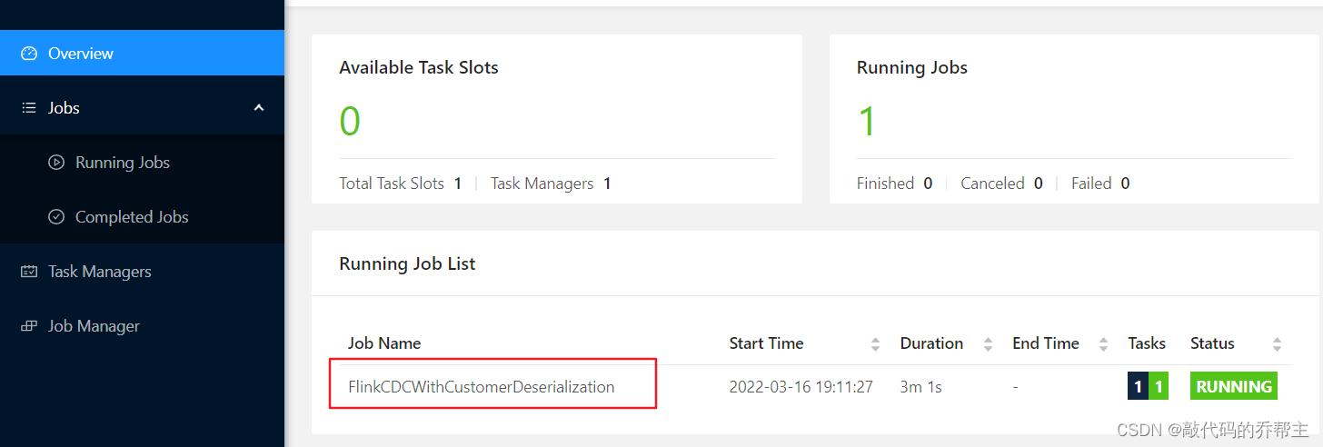 - 运行该Flink任务:/opt/software/flink-1.12.7/bin/flink run -m yarn-cluster -ys 1 -ynm gmall-flink-cdc -c com.ucas.FlinkCDCWithCustomerDeserialization -d /root/mySoftware/gmall-flink-cdc.jar