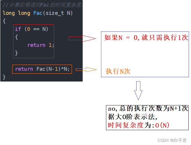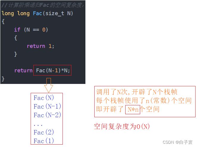 由于递归调用的次数与输入 N 成正比,并且每次调用中的工作量是常数时间的(乘法操作),