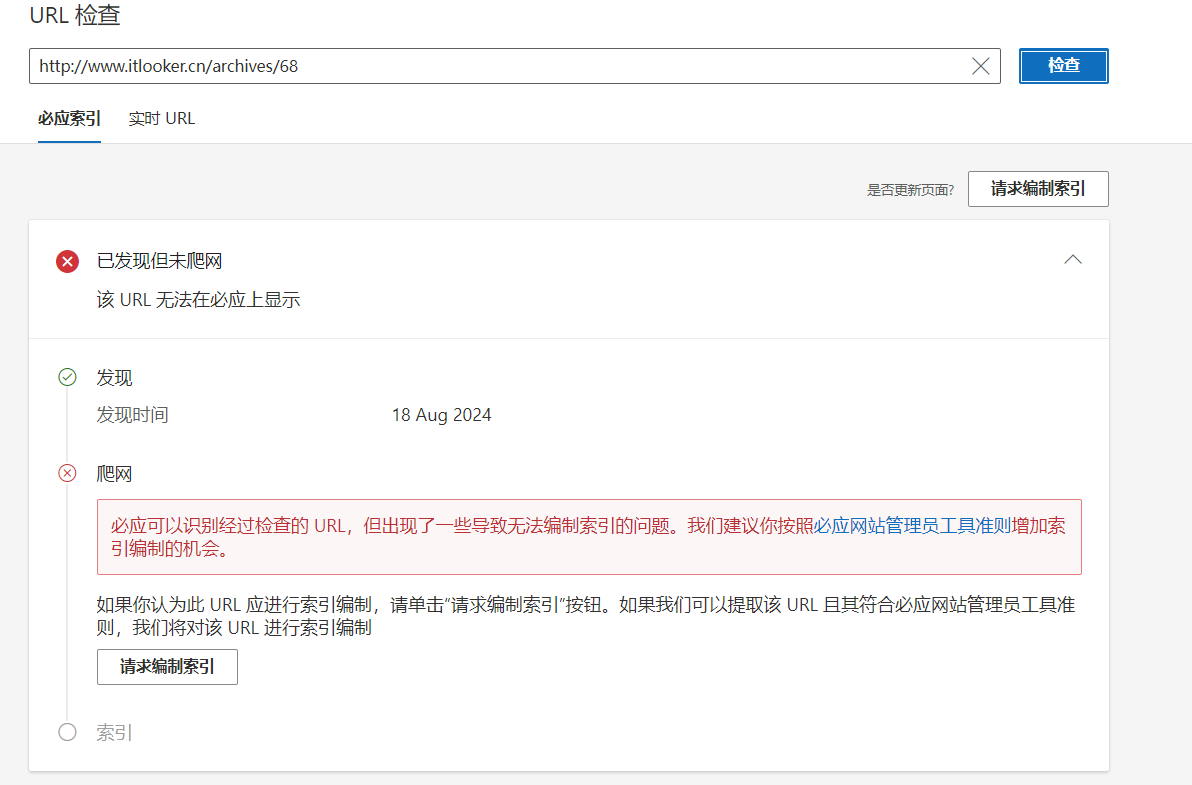 SEO优化:如何优化自己的文章,解决搜索引擎不收录的问题 可以使用bing的URL检查,来检查自己的文章是不是负荷收录准测,如果页面有严重的错误,搜索引擎是不会进行收录的,而且还会判定文章为低质量文章!下面的页面就是有问题,当然如果是误报你也可以请求编制索引向搜索引擎提交。根据排查出来的问题将进行解决,严重问题必须要解决否则搜索引擎不收录。点击实时的URL预览,可以检查当前的文章存在哪些问题。如果真的有问题就是要进行排查一下了。解决完所有问题有助于页面更好的收录。