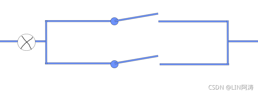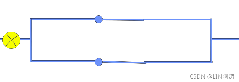 如图:这是一个并联电路它的两个开路开关只要有一个闭合则 灯泡就可以正常点亮