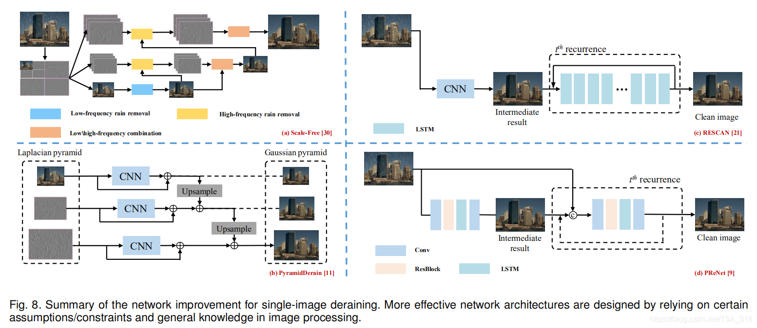 自基于深度学习的去雨发表以来[1,19],一系列的方法旨在通过特定的假设/约束和图像处理的一般知识,设计出更有效的网络架构。