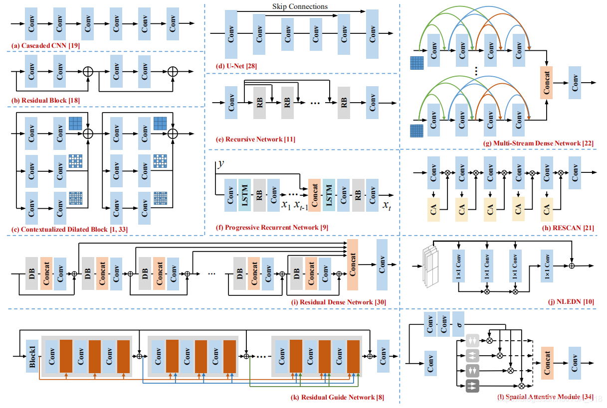 多流密集网络[22](图9 (g))结合了密集块网络和卷积网络。残差密集网络[30](图9 (i))将密集块集成为残差网络。在[8]中(图9 (k)、(e)),基本块采用递归连接,其中输入特征也被转发到网络的中间特征。在[9]中(图9 (f)),残差块也采用递归的方式聚合,并选择LSTMs来连接不同的递归。