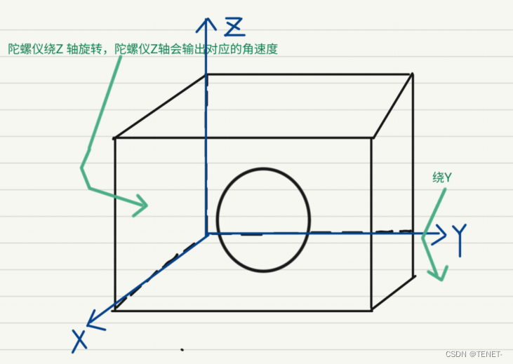 - 陀螺仪绕Z轴旋转,陀螺仪Z轴会输出对应的角速度。