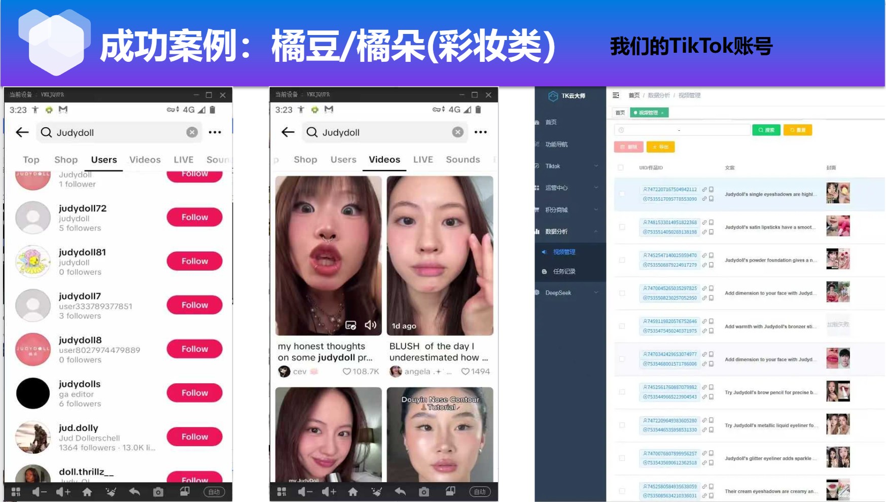 国内头部美妆品牌橘朵,借助专业运营工具搭建的全链路运营体系,精准开拓欧美美妆市场,优化TikTok引流转化全链路策略。仅运营1个月,品牌单日最高曝光量破150万,单条内容播放峰值达300万;日均订单增长80%,自然流量占比从20%跃升至60%,显著降低广告投流成本,成功构建起“流量-转化”的良性增长闭环。