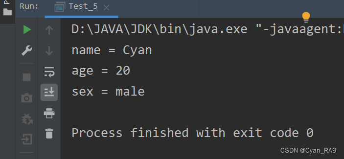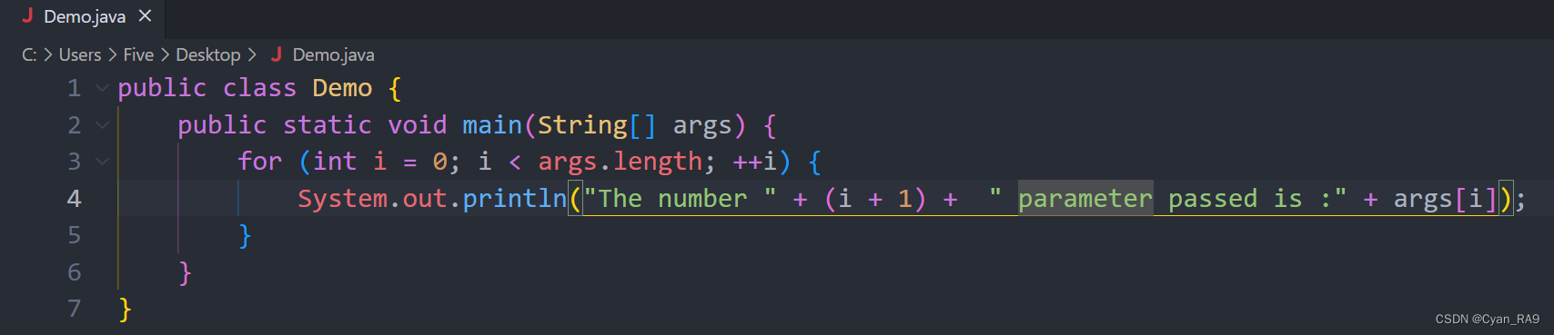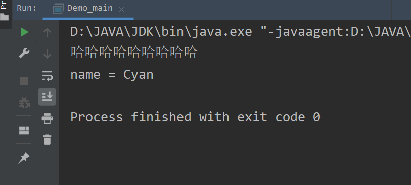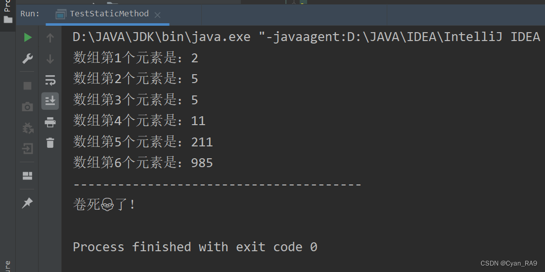 在演示的GIF图中大家可以看到,Demo.java文件编译后,up在运行时手动传入了三个实参Cyan,Rain和TY,并且都随着打印args数组的语句的执行而成功输出了。