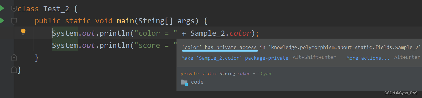 在上文static的使用中,我们提了一嘴——类变量既可以通过“类名.”的形式来调用,也可以通过“对象.”的形式来调用,但是建议大家优先使用“类名.”的形式来访问类变量。这里还要补充一点:在访问类变量时,也要遵循访问权限修饰符的规则。比如,如果某个类的一个静态属性为私有的,那么你就不能在其他类中直接访问这个静态属性。