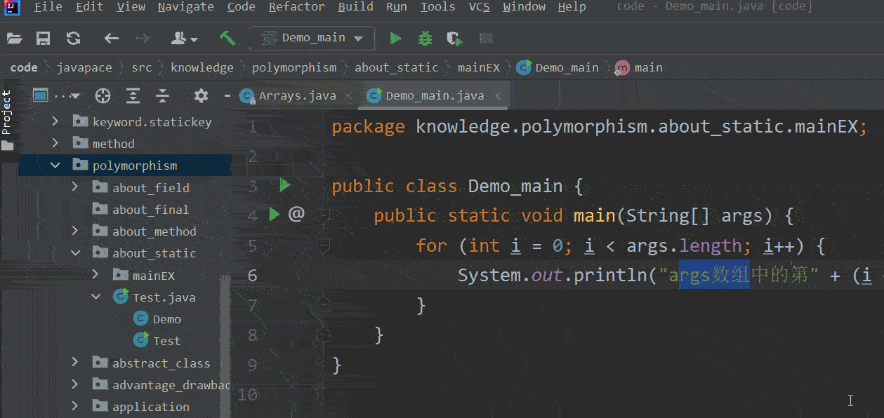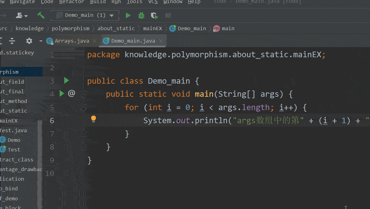 说实话,也没啥演示的😂。给大家演示一下工具类静态方法的调用和自定义静态方法的调用吧。up以TestStaticMethod类和Demo类为栗,我们在TestStaticMethod类中定义一个数组,并用Arrays类的sort方法对其进行排序,再遍历排序后的数组。在Demo类中定义一个静态方法,然后在TestStaticMehtod类中的main方法中利用类名来调用该静态方法。