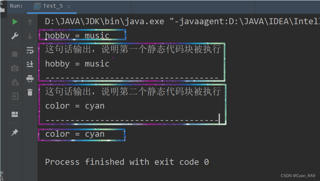 首先,main函数第一条输出语句中调用了Demo.hobby,hobby是静态常量,并且是个在定义时就已经赋了初值的静态常量,因此调用Demo.hobby时不会加载类,静态代码块中的语句也就不会执行。但是,main函数第二条输出语句中调用了Demo.color,color也是静态常量,但它是个在定义时没有赋初值,而在静态代码块中才进行了初始化的静态常量,因此调用Demo.color时会加载类,静态代码块随着类的加载而被执行。因此,控制台上按照定义的顺序先后打印出了两个代码块中的内容。类加载后,才打印出了输出语句中的color变量。