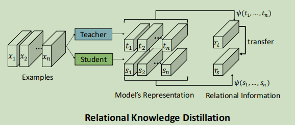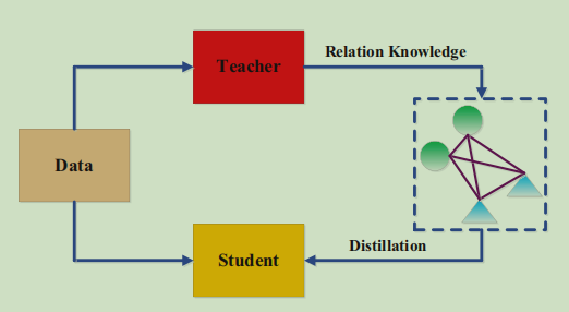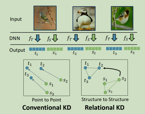普通的知识蒸馏(上图中左侧的Conventional KD)中学生神经网络学习到的是一对一的教师神经网络产生的知识,而在关系层知识蒸馏(上图中右侧Relational KD)中学生神经网络学习的是知识之间的结构关系(Structure Knowledge),增强知识蒸馏的泛化性。