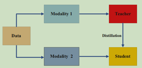 数据集是一个多模态的数据集,比如包含声音、图像、文本,在A模态上训练教师神经网络,然后在利用B模态训练学生神经网络的时候利用知识蒸馏,相当于一种多模态融合方法。