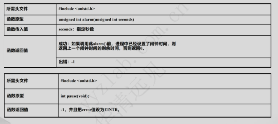 alarm()也称为闹钟函数,它可以在进程中设置一个定时器。当定时器指定的时间到时,内核就向进程发送SIGALARM信号。(以秒为单位,若设置多个定时器,按最后一个执行)