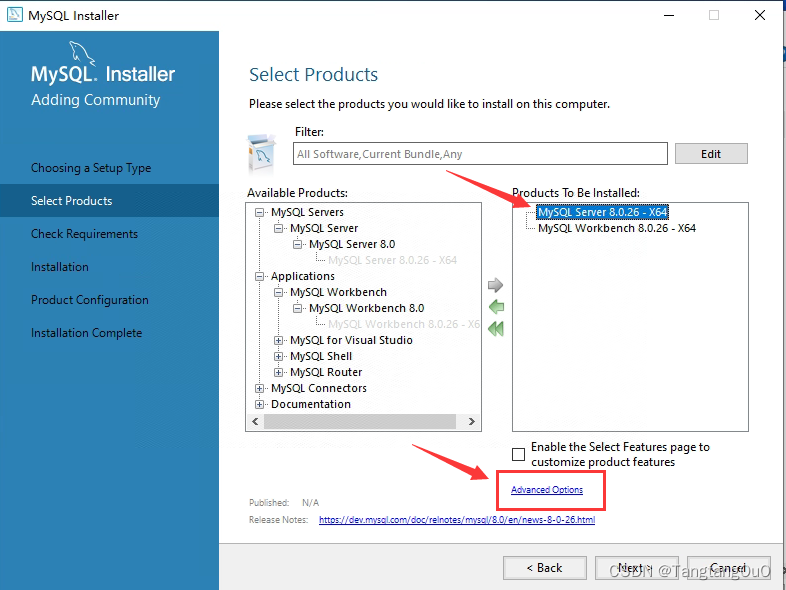 选中MySQL Server 8.0.26 -x64 ,这个时候右下侧会出现 Advanced Options,点击它。