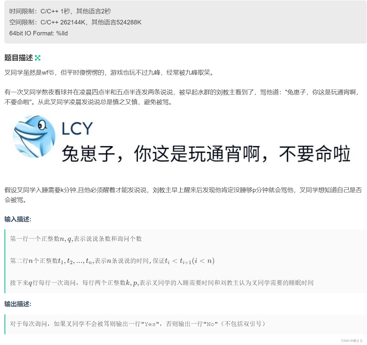 虽然这题存在一个入睡时间k, 但和原做法也差别不了太多, 首先看t数组, 做差分, 得到叉同学发说说的间隔时间, 由题意得, 入睡需要k时间, 那么间隔时间<k的间隔时间说明叉同学压根就没睡着, 不能计入总和与p比较, 遍历一遍判断所有的差分是否都大于k的才能加入总和, 可这样遍历的复杂度就是O1e6, 加上q次询问, 最高复杂度可达到O1e12 !