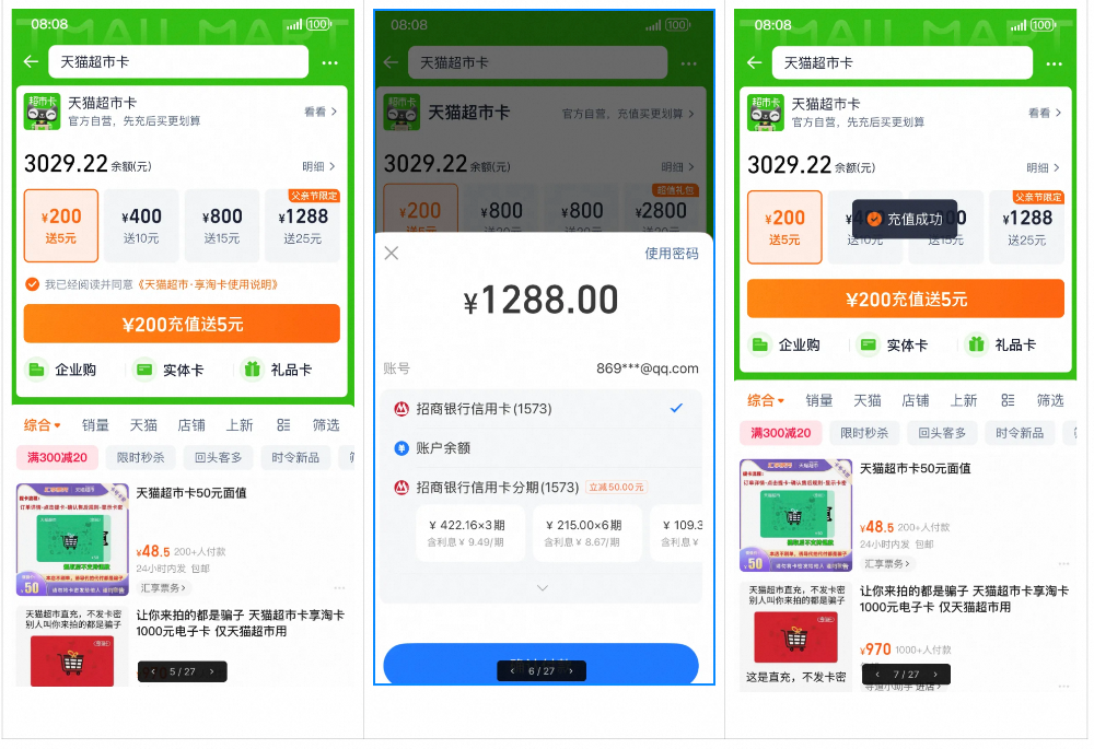每天有较多用户在手淘搜索:天猫超市卡,经与搜索团队沟通,可在搜索长颈鹿场景下,直接透传猫超卡充赠组件,提升用户转化,给用户提供最直接的猫超卡充值服务。