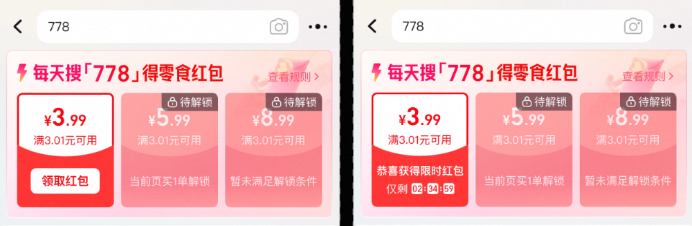 红包产品定义:1. 红包数量:2/3个,否则不展示2. 红包状态:未解锁、待领取、已领取展示倒计时、已使用● 每个红包项显示金额、门槛、行动名称● 针对红包的不同状态行动点有不同的展示文案和样式,具体见设计稿● 整体容器和每个 item 都需要曝光埋点● 使用 Appear 组件,arg1 分别为 "Search_giraffeExposure" 和 "Search_giraffe_ItemExposure"● 点击事件埋点 arg1=Search_giraffe_ItemClick● 使用 Flex 布局,颜色适配暗黑模式● 所有字段使用 TypeScript 类型定义