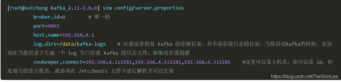 Port即为kafka服务所监听端口,host.name即是本服务器的ip地址,broker.id用于唯一标识集群中的kafka服务,这里将默认的0修改为1以于myid对应。Zookeeper.connect即是Kafka服务与zookeeper集群的连接,我们将端口设置为2181。