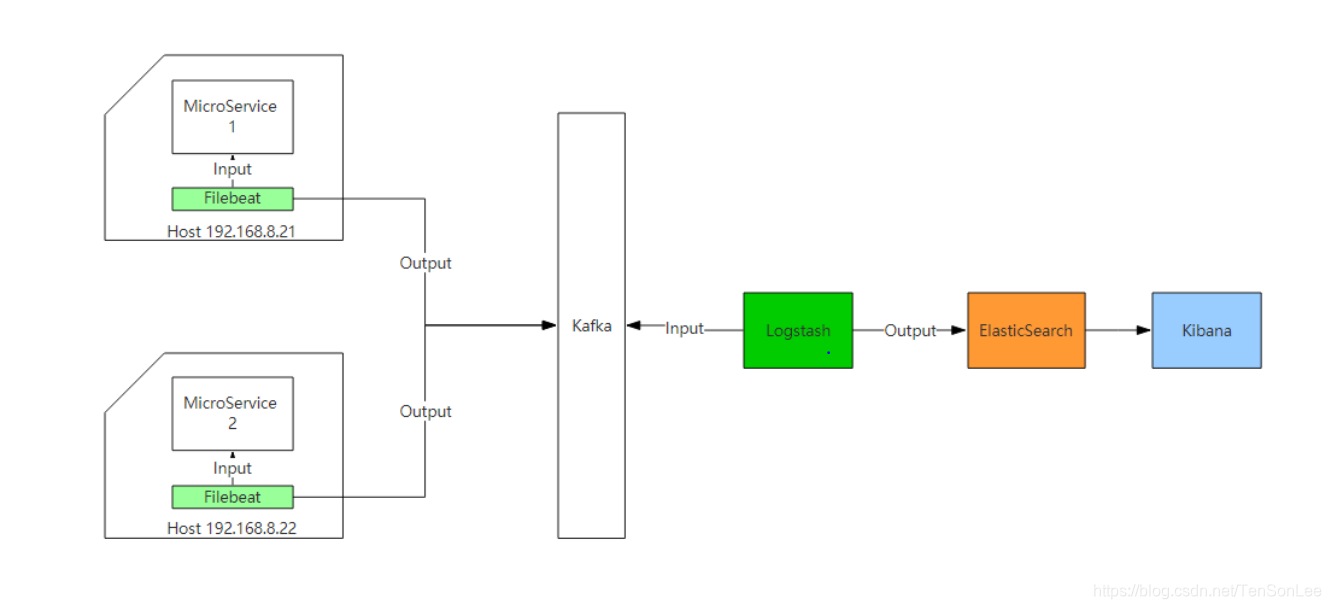 Logstash基于管道的理念,有一个输入流和对应的输出流,我们只需要配置输入流入口和输出流的出口即可。在本系统中输入流入口即是kafka服务的输出,输出流出口即是elasticsearch服务集群的地址集合。基础结构如下图所示。