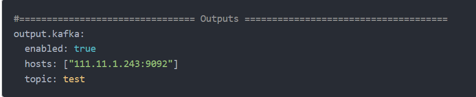 如图所示,我们将输出方向配置为kafka,hosts即是我们配置的kafka服务集群ip地址,每一个kafka服务地址放在双引号中,不同地址之间以引号隔开。具体地址配置请和kafka配置统一。