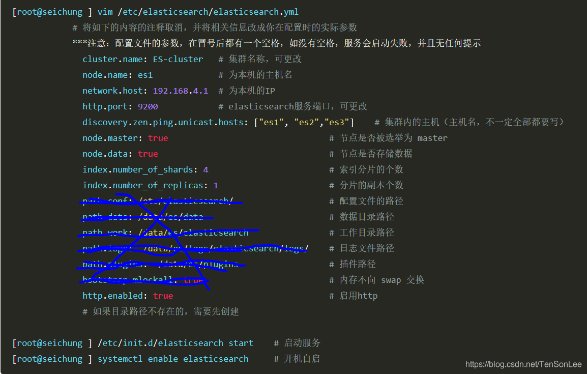 在os1上依图示进行配置。集群主机名如果不写ip地址的话,需要在/etc/hosts文件里配置相应的映射。配置完后拷贝到os2和os3上,只需修改node.name为es2和es3即可。