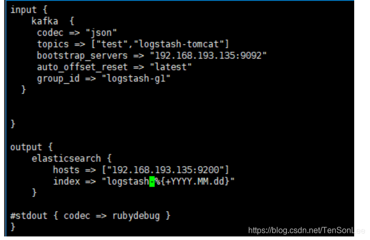 在input下我们指定输入为kafka服务,其中topics即是我们感兴趣的topic集合,类似于消息订阅,只有写入这个集合的topic logstash才会接收。Bootstrap_servers即是kafka服务的地址,我们部署了kafka集群,所以这里应当用中括号包围和逗号隔开分别书写每个kafka服务的ip地址+9092端口号。