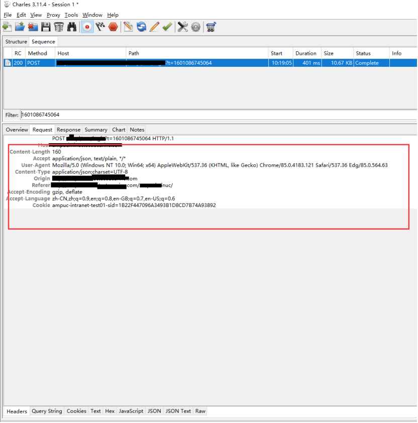 下图为方式2,通过抓包工具查看到的某接口的请求信息头(Request-Headers)