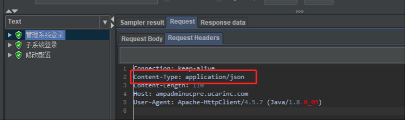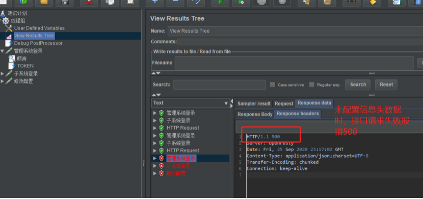 下图中POST方式的登录接口未设置HTTP Header Manager,运行jmeter脚本发起接口请求时默认Content-Type:text/plain(纯文本格式),所以请求会报错,返回状态码500。