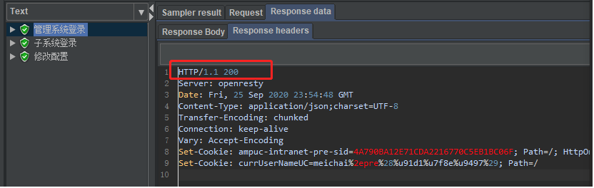 信息头配置正确后,运行jmeter脚本接口请求成功,返回状态码200。
