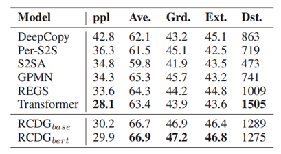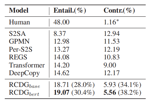 1.回复的一致性。考虑到有限样本的情况下人工标注难以得到足够的一致类别的样本,论文主要使用自然语言推理技术模型DIIN对生成的回复进行分类。结果如表1所示。其中,论文的方法缩写为RCDG,即Reinforcement Learning based Consistent Dialogue Generation。Entail.表示回复与角色信息一致的比例,值越高越好;Contr.表示回复与角色信息相矛盾的比例,值越低越好。同时,论文也给出了测试数据的相关比例。可以发现,PersonaChat中并非所有对话都与角色信息相关。此外,论文也的确在数据集中发现了极个别存在的矛盾回复。