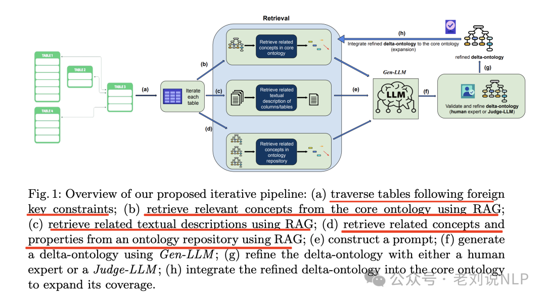 (a)按照外键约束遍历表;(b)使用RAG从核心本体中检索相关概念;(c)使用RAG检索相关文本描述;(d)使用RAG从本体库中检索相关概念和属性;(e)构建提示;(f)使用Gen-LLM生成增量本体;(g)通过人类专家或Judge-LLM对增量本体进行细化;(h)将细化后的增量本体整合到核心本体中,以扩展其覆盖范围。