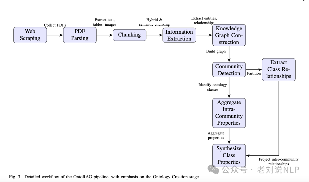 主要流程如下,包括六个阶段:网络抓取、PDF解析、混合分块、信息提取、知识图谱构建和本体创建。