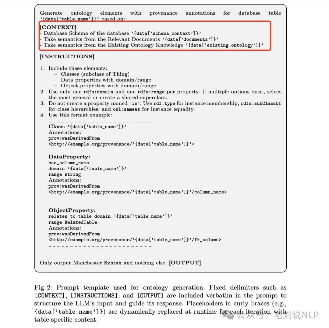 固定的分隔符(如[CONTEXT]、[INSTRUCTIONS]和[OUTPUT])被逐字包含在提示中,以结构化LLM的输入并引导其响应。花括号中的占位符(例如,{data['table_name']})在每次迭代时都会动态替换为特定于表的内容。
