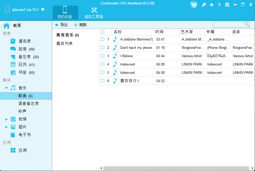 03点击“音乐”选项打开 iPhone 音乐库文件夹。您可以在右侧面板中浏览所有文件。此工具将完整显示所有音乐文件,包括类型、标题、时长、大小、流派、艺术家等信息。