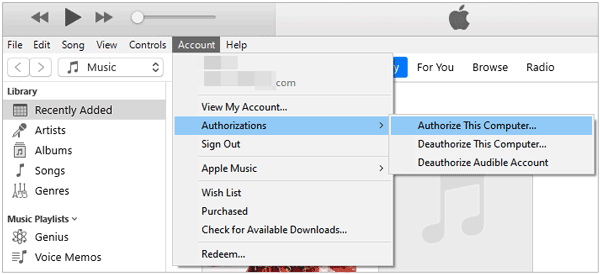 步骤 3. 在Mac上打开 iTunes,然后转到“帐户”>“授权”>“授权此电脑”,然后点击“授权”。