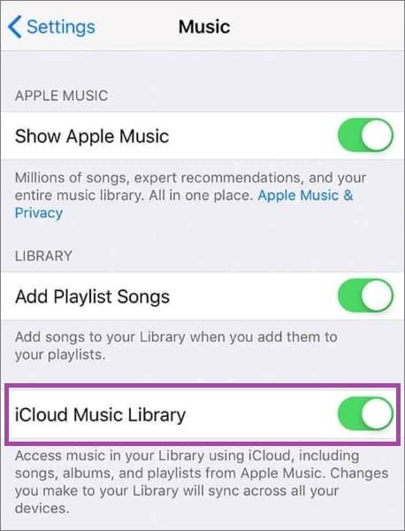 步骤 2. 找到“iCloud 音乐库”选项并将其打开。