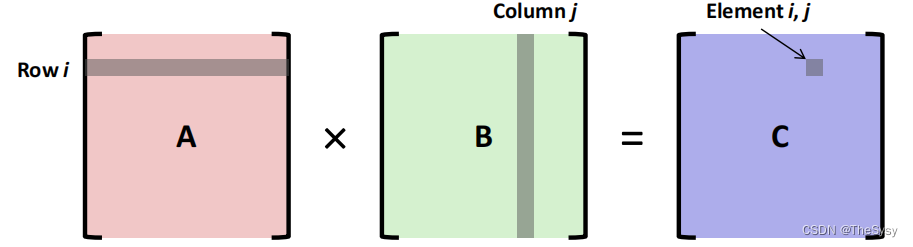 然后i,j确定下来后,就去用k遍历A矩阵的一行和B矩阵的一列来计算结果元素。