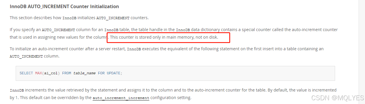 MySQL8.0以下版本重启后自增主键值丢失问题 上周运维同学重启了UAT环境的MySQL数据库服务,刚开始我是不知道数据库重启了,先是业务服务开始异常,初步定位到的原因是一个表的主键ID出现了回退,又查到MySQL低版本(8.0以下)重启可能会导致自增主键值回退或重置,最后和运维同学确认了下重启时间,确认了原因。正如前文中所说,这种方式复杂且风险很大,MySQL8.0并不完全兼容低版本,升级后这个问题解决了,但可能会导致其他方面的问题,所以生产环境一般是不会同意这样做的。在MySQL8.0中,执行同样的操作,自增值仍为6,没有丢失,这里就不演示啦!