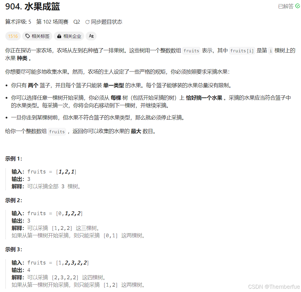 你带的篮子只能摘两种水果,但是数量不限,且得按顺序摘,到了这个果树就必须摘,不能跳过。