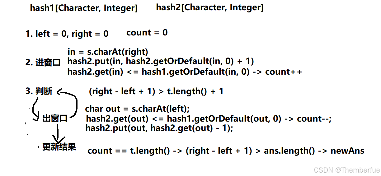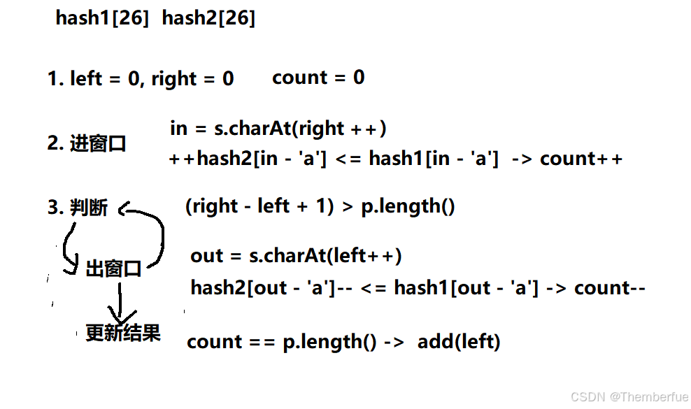 · 利用这个思路,我们借助两个哈希表解决,进窗口,判断条件,出窗口,但在添加结果时,我们需要同时遍历两个哈希表,查看其字符种类数量是否相同。否则不能添加结果。