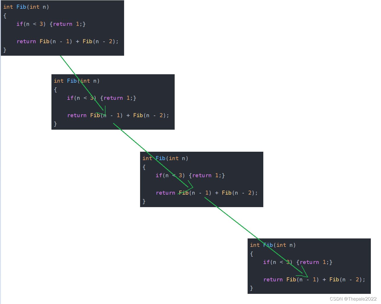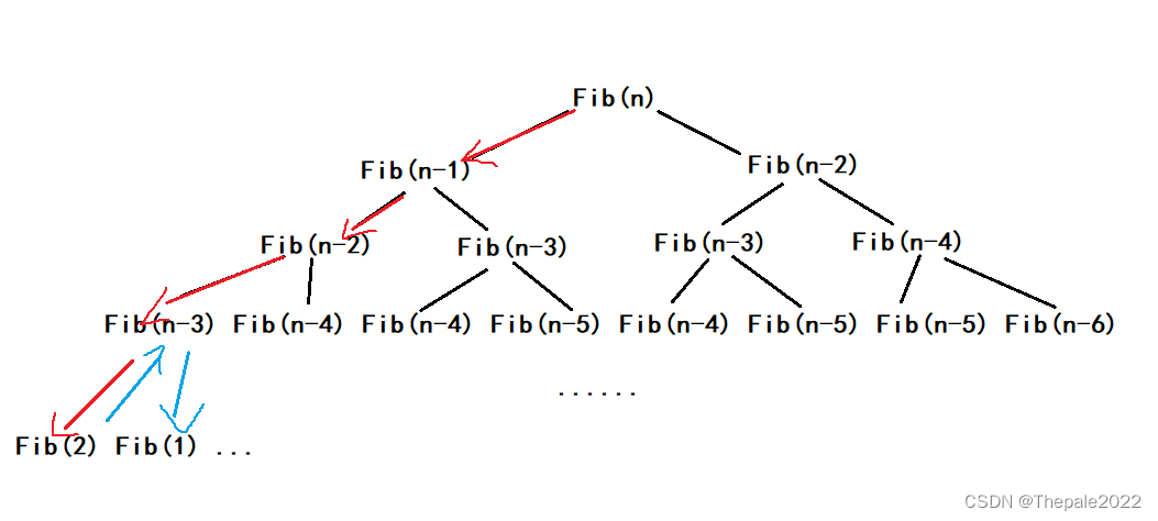 并不是 Fib(n - 1) 执行后马上去执行 Fib(n - 2),而是一直向 Fib(n - 1) 执行,直到跳出: